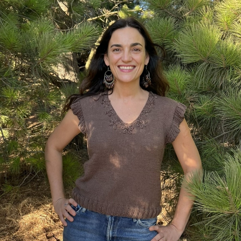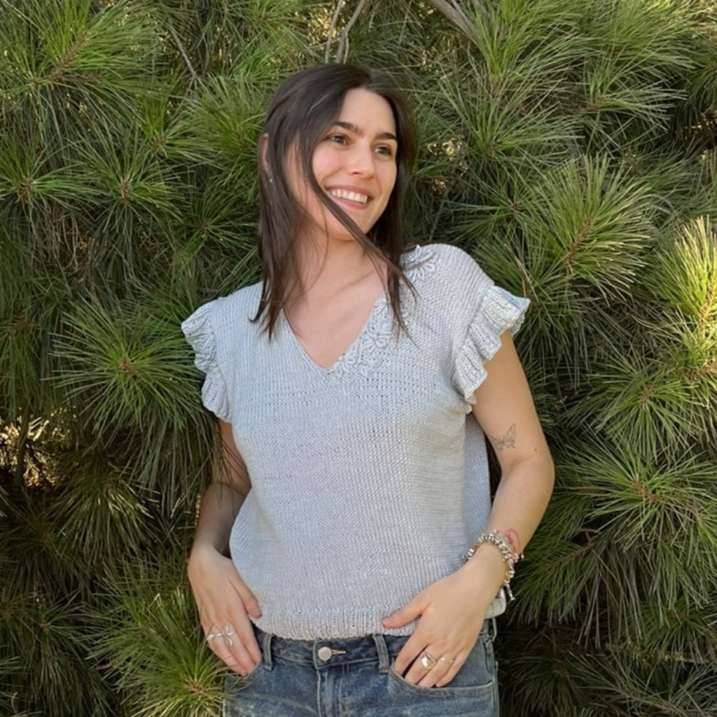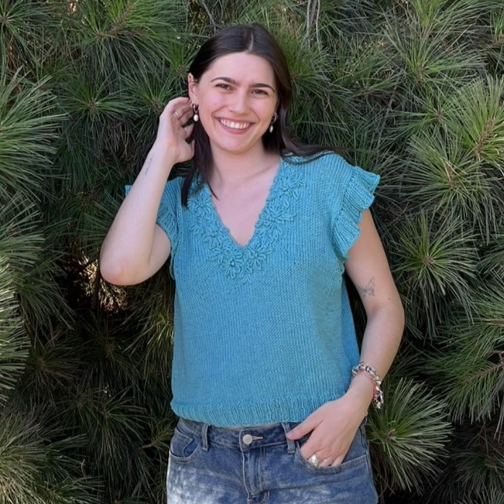 El Top Azucenas es una prenda delgadita y delicada para el verano, holgado y largo pensando en quienes no quieren mostrar tanta piel. Como soy maximalista de corazón, le bordé en el mismo tono unas flores, que se asemejan a las azucenas. Y de ahí nace su nombre. Es muy sencillo de tejer. Siguiendo las instrucciones, se puede hacer fácilmente.